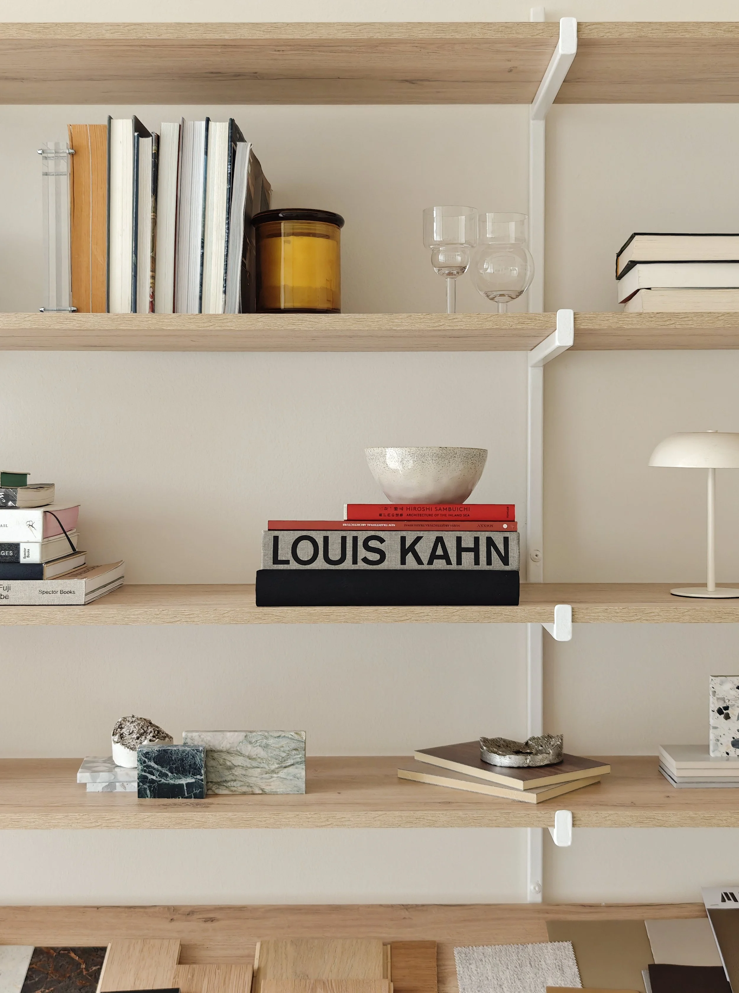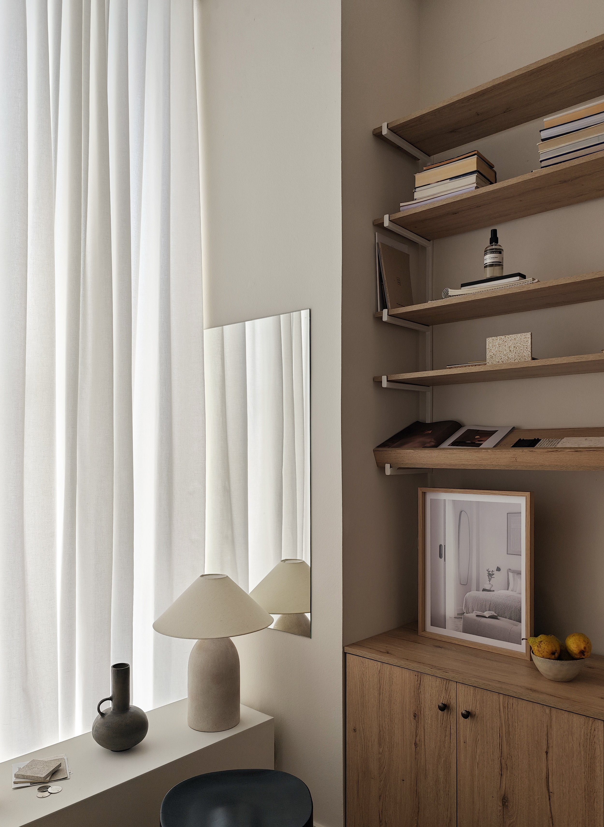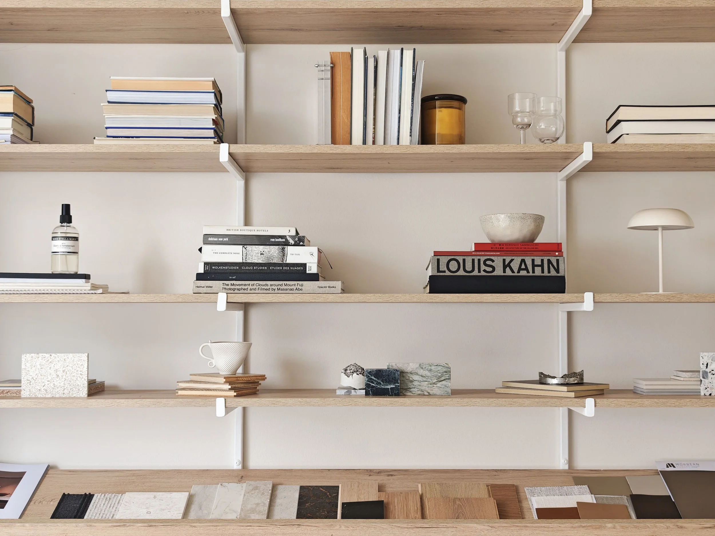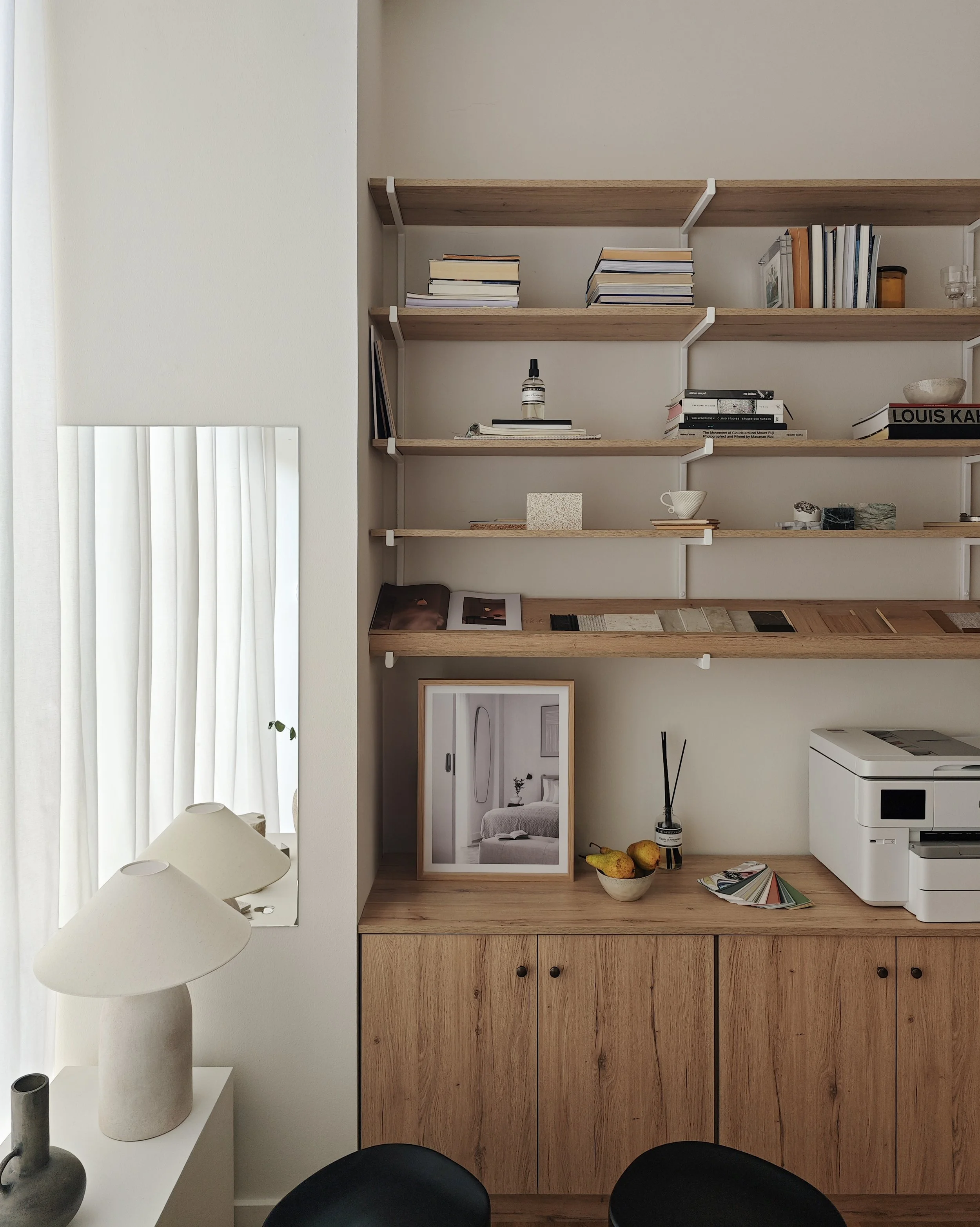 At just 25 sqm, the studio operates as both office and workshop. The plan is organised around a full-height material library that acts as a working wall. It holds samples, fragments, mock-ups and objects in constant rotation. Timber, stone, fabric and plaster are placed side by side, compared in natural light and re-evaluated over time. The wall is not decorative. It is a tool.