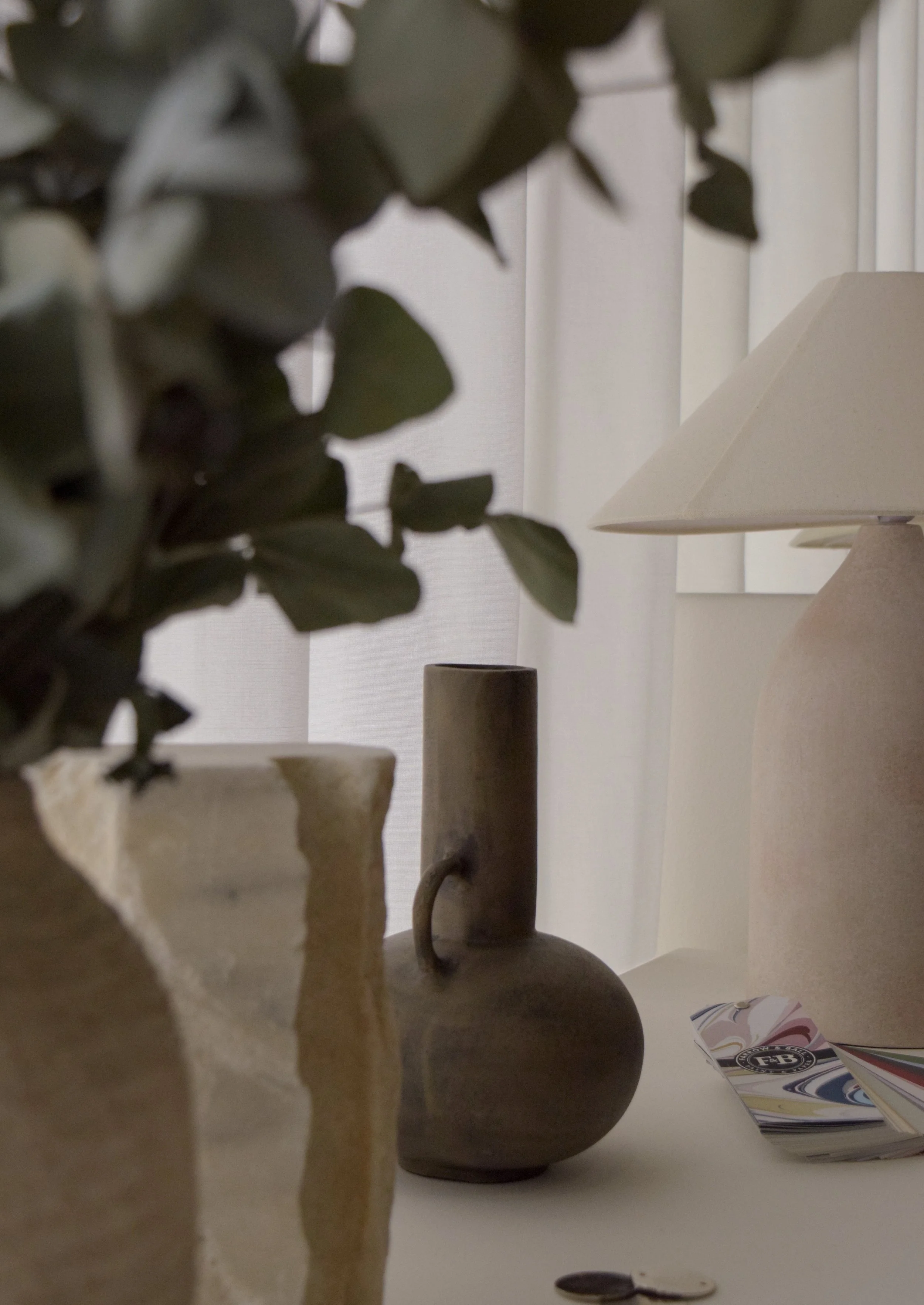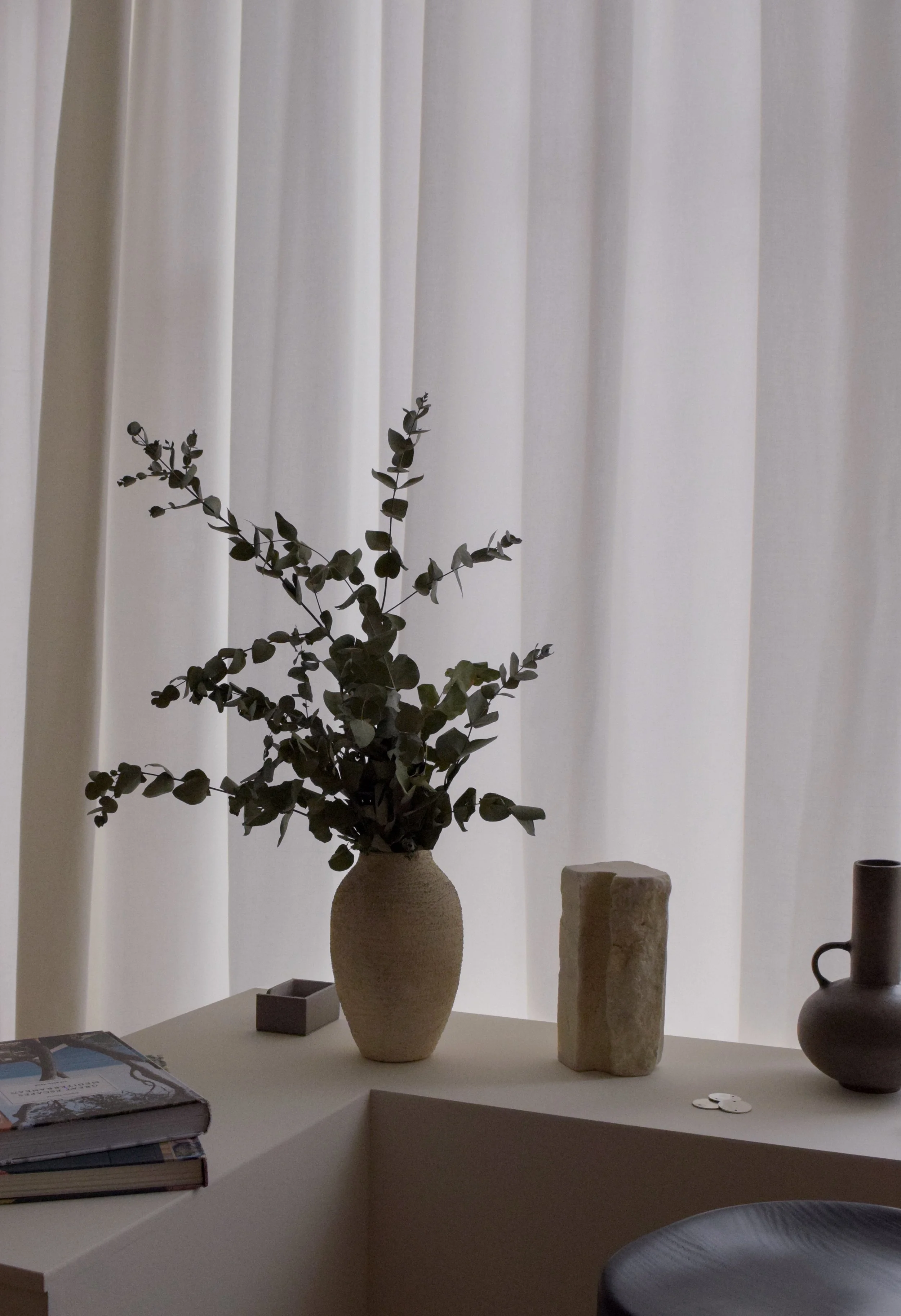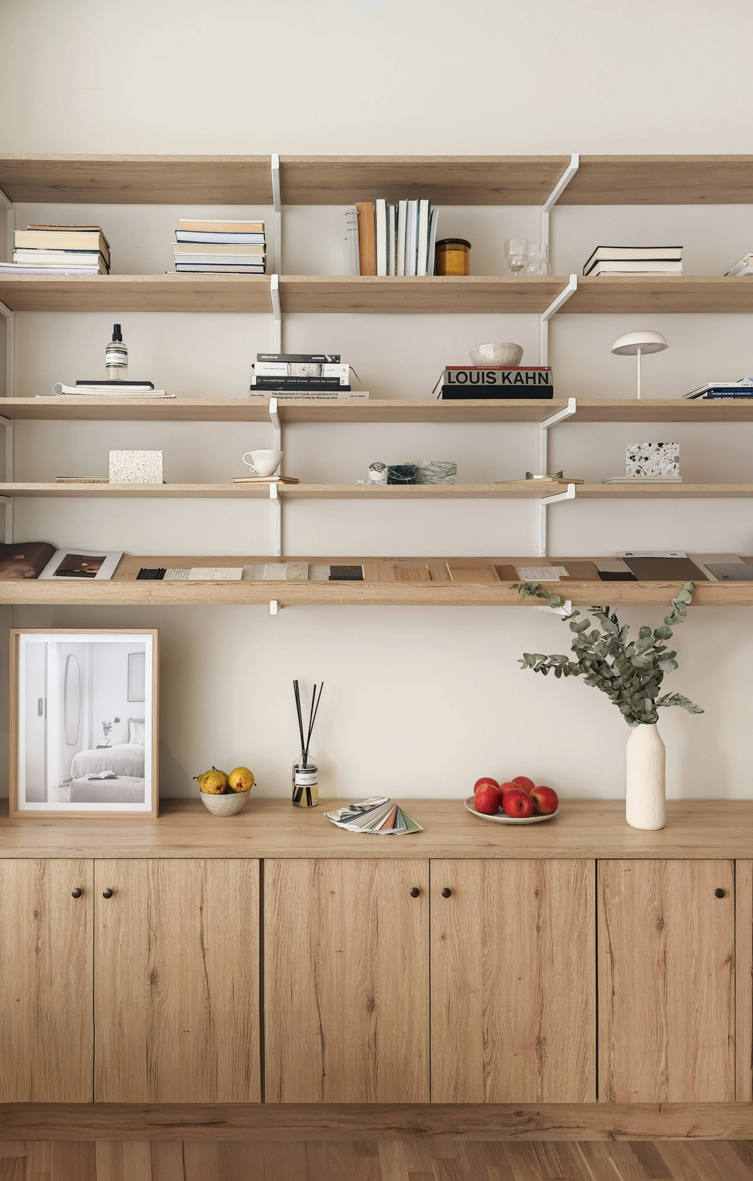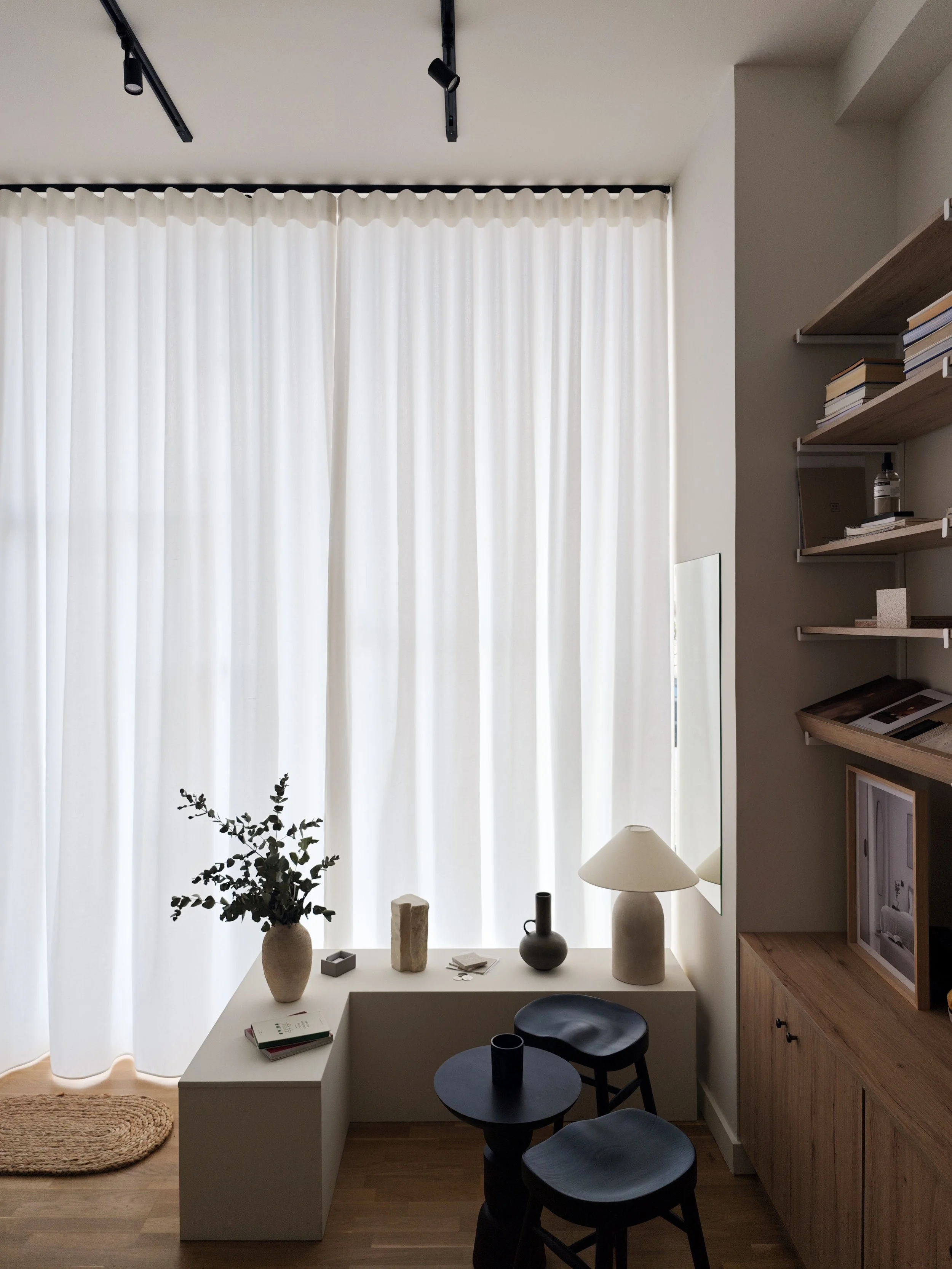 At just 25 sqm, the studio operates as both office and workshop. The plan is organised around a full-height material library that acts as a working wall. It holds samples, fragments, mock-ups and objects in constant rotation. Timber, stone, fabric and plaster are placed side by side, compared in natural light and re-evaluated over time. The wall is not decorative. It is a tool.