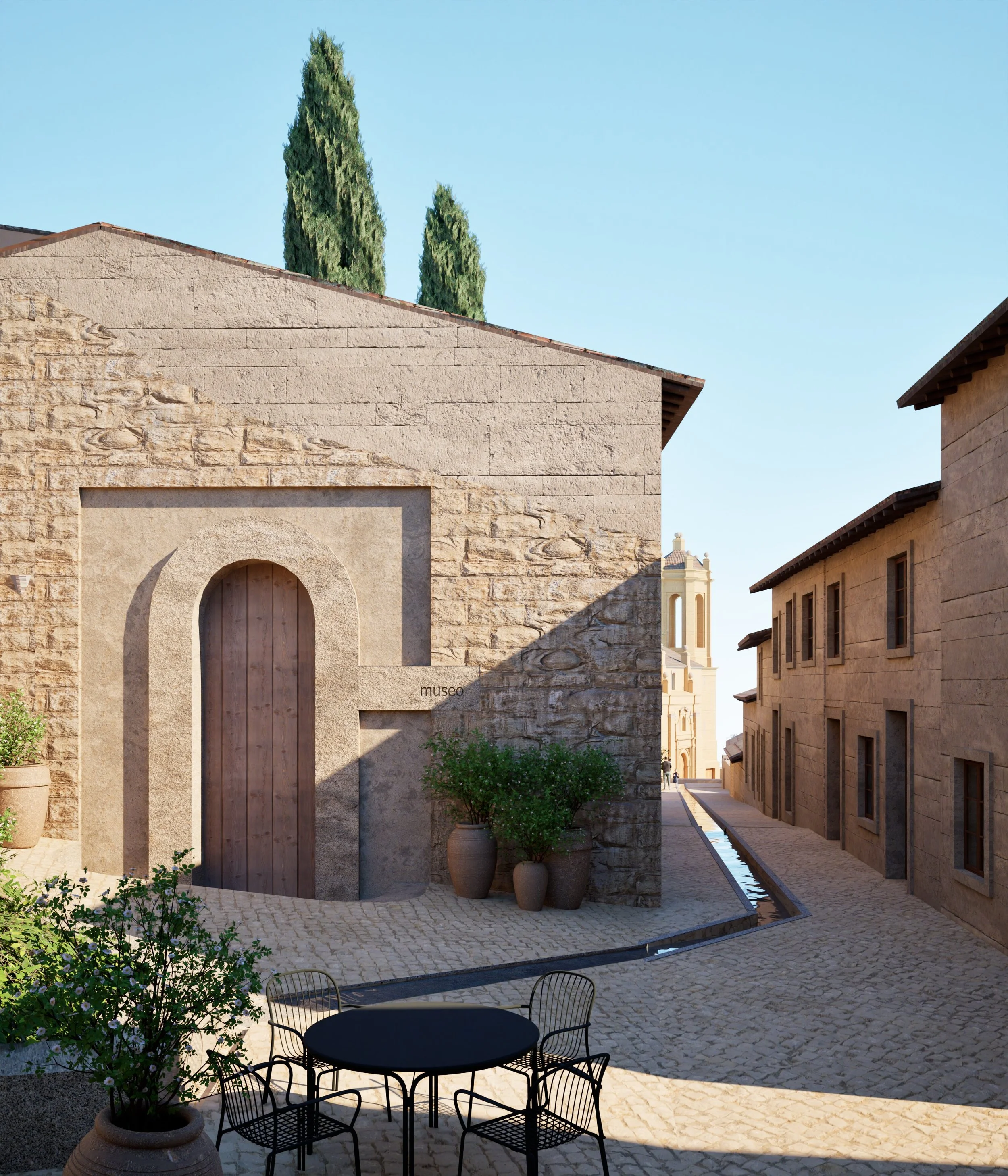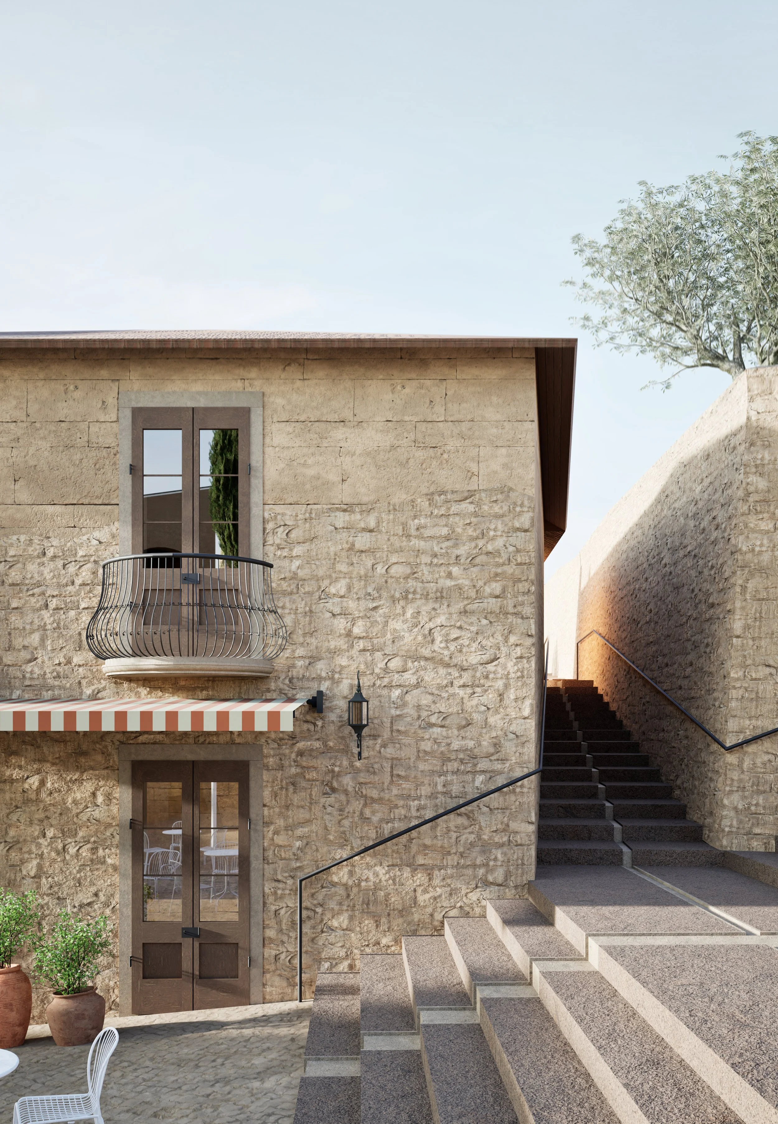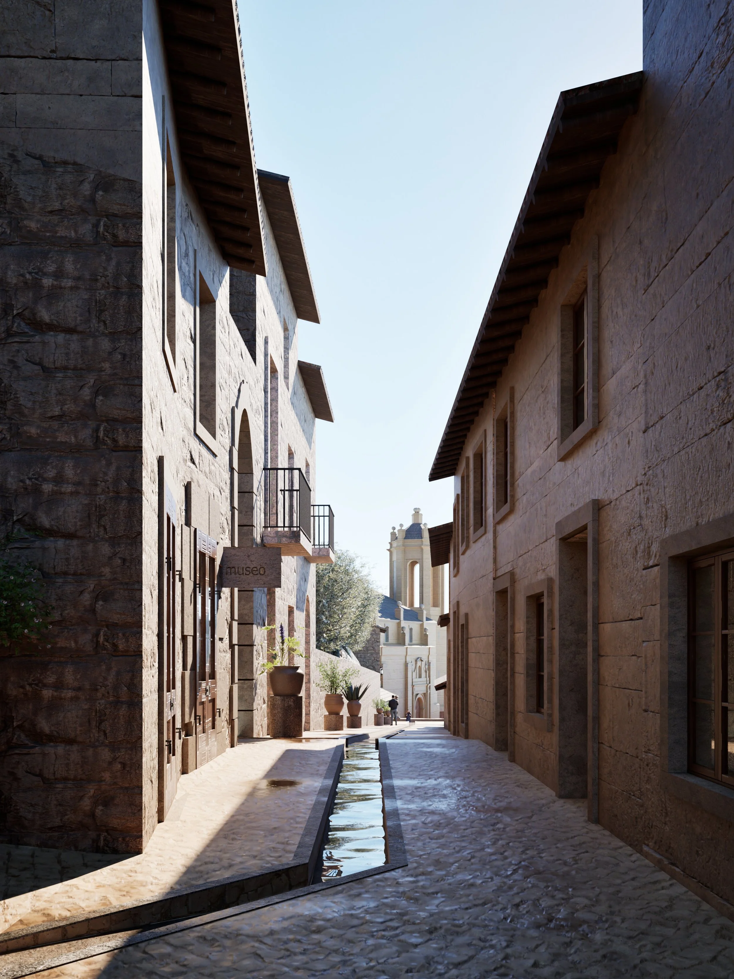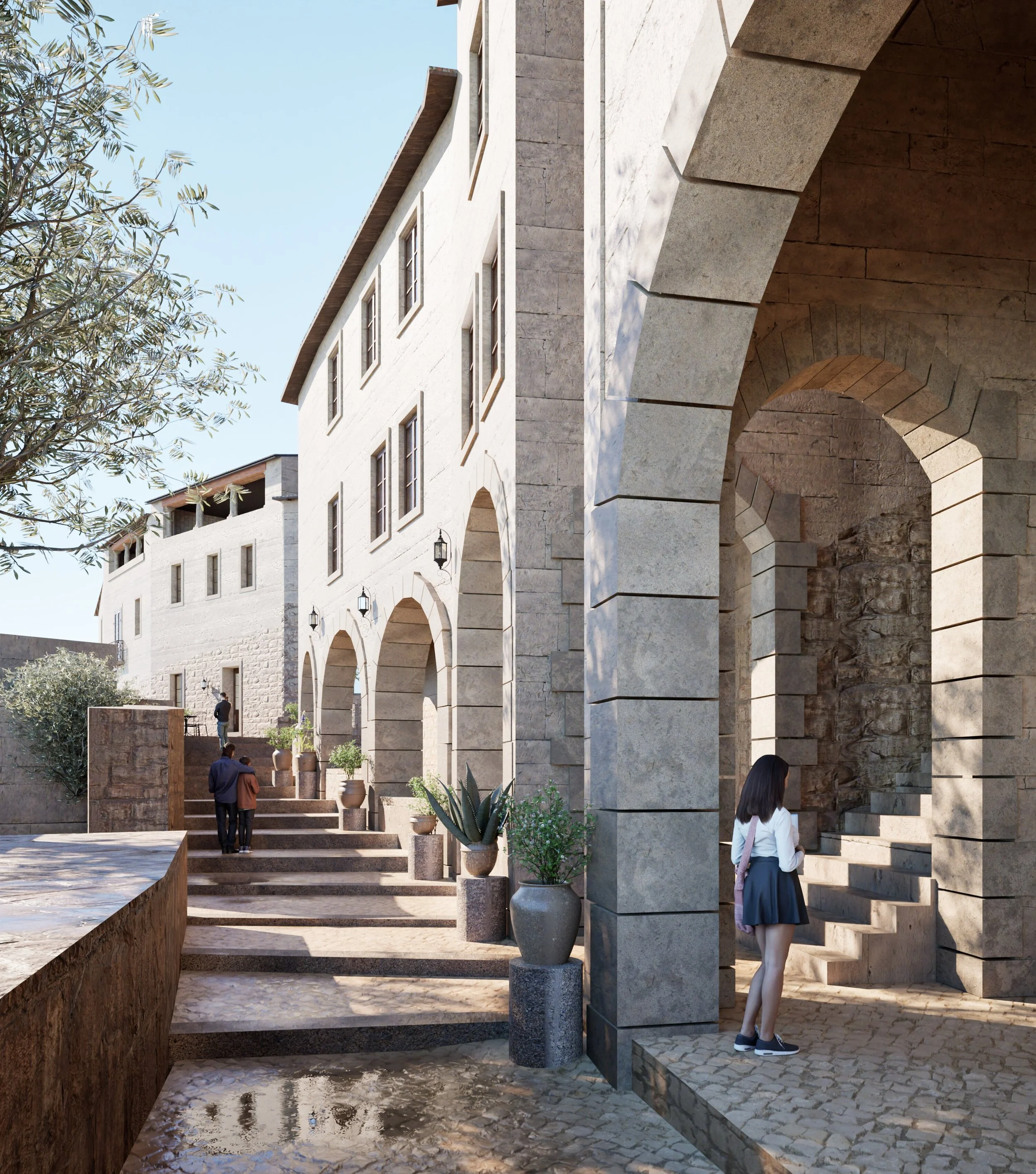 The design draws on local construction techniques and materials - stone, lime plaster, timber - and applies them in a contemporary vernacular. New buildings extend the massing, rhythm and proportions of the existing fabric while adapting to modern patterns of living. Thresholds, arcades, and deep window reveals mediate between public and private life, creating a streetscape that feels at once lived-in and enduring.