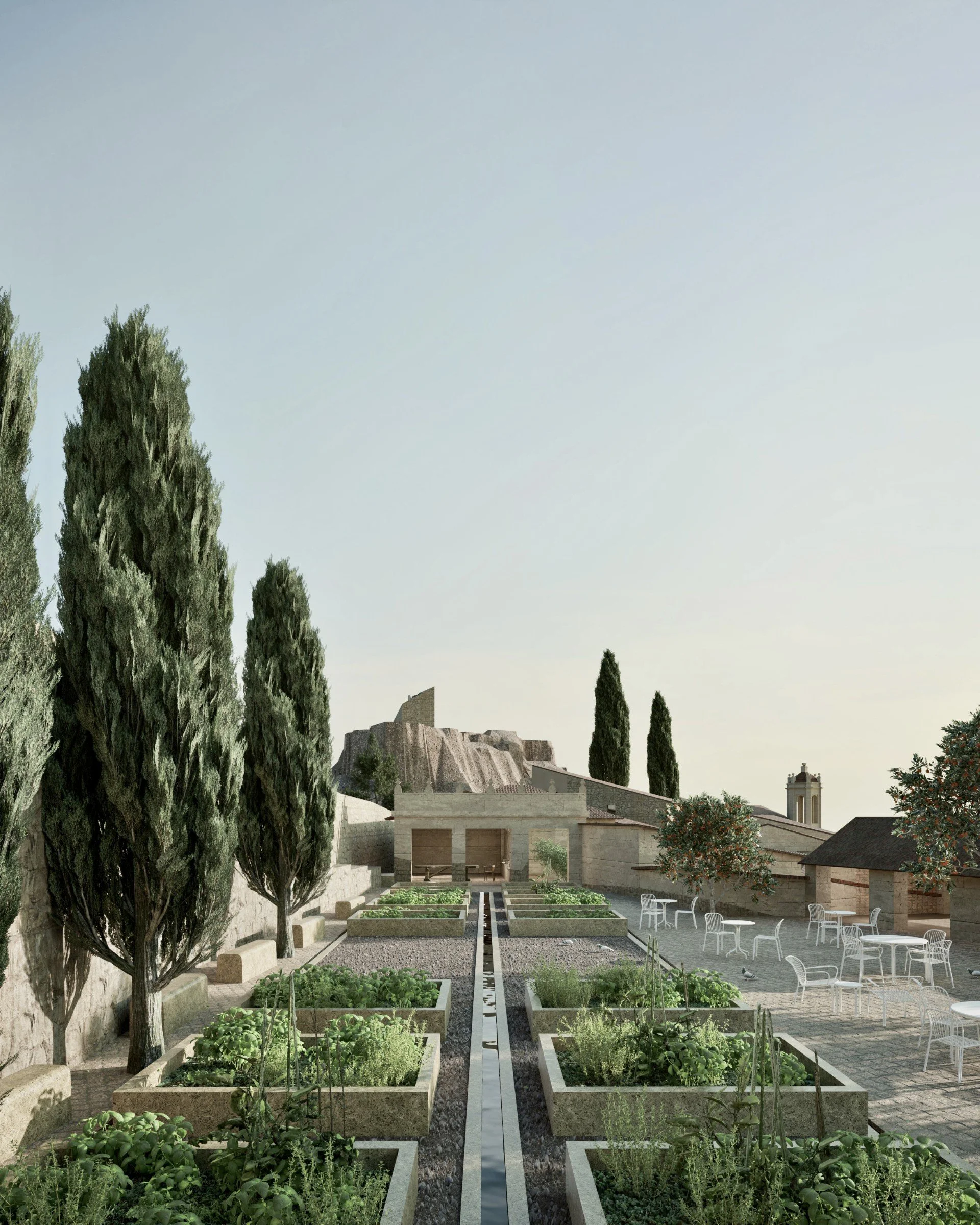 Working with the grain of the historic town, the scheme introduces a series of modest buildings arranged around stepped streets and planted courtyards.