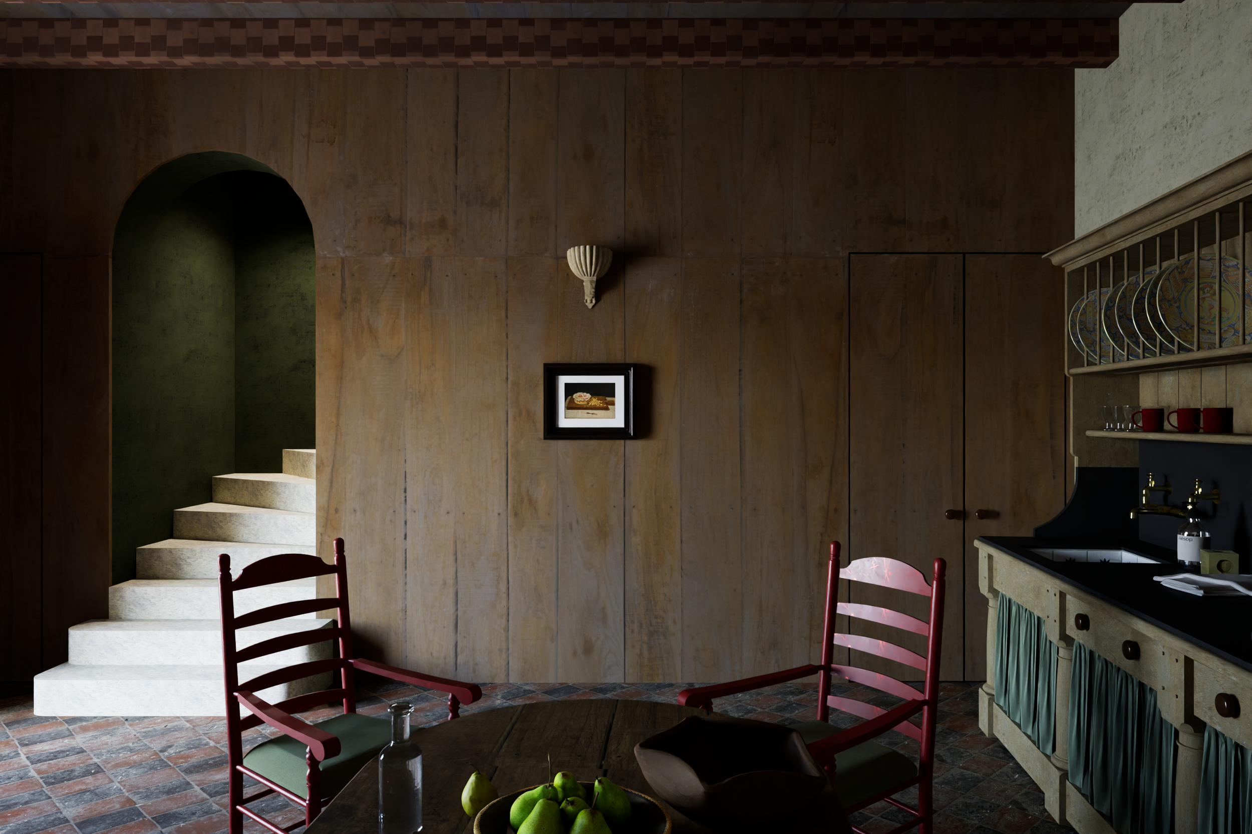 The interiors are shaped by a careful study of local materials and construction methods. Limewashed walls, terracotta tiles, and carved timber elements are combined in a simple, enduring palette. Vaulted ceilings and deep window reveals introduce rhythm and scale, while openings are positioned to frame long views across the valley.